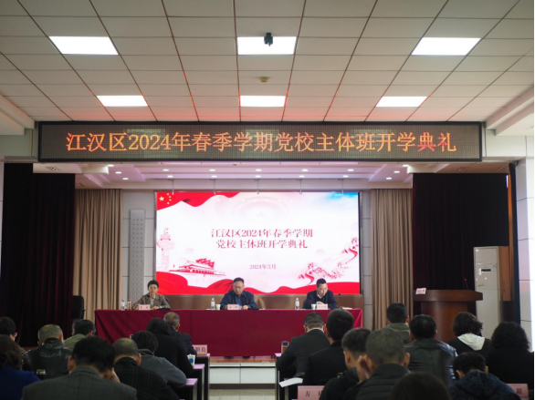 3月26日下午,我校举行2024年度春季学期主体班开学典礼。区委常委、区委组织部部长姜辉以“牢固树立和践行正确政绩观,在推进中国式现代化武汉实践中展现江汉担当”为题,为学员讲授开学第一课。江汉区习近平新时代中国特色社会主义思想培训班(第9期)、年轻干部培训班(第10期)、科级干部任职培训班(第5期)全体学员参加开学典礼。