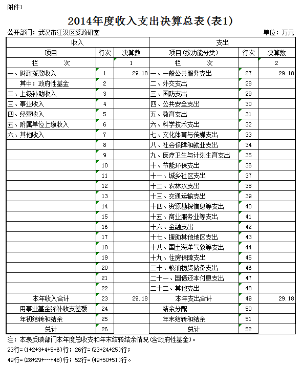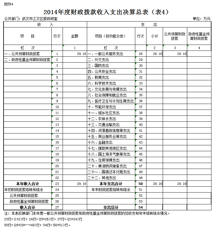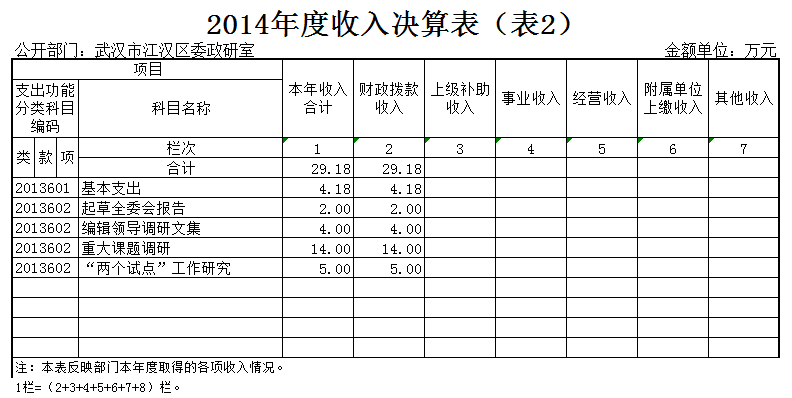 武汉市江汉区委政研室2014年度本年收入合计29.18万元。其中:财政拨款收入(含政府性基金拨款)29.18万元,占本年收入100%。