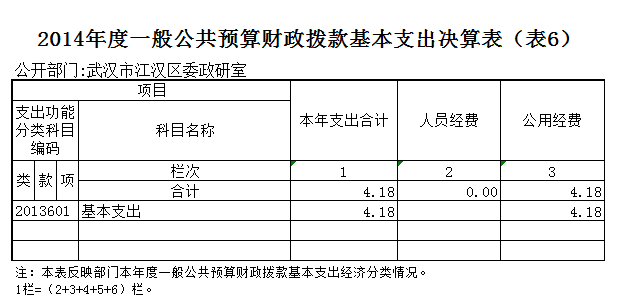 武汉市江汉区委政研室2014度一般公共预算财政拨款基本支出4.18万元,其中,公用经费4.18万元,主要包括:办公费、印刷费、咨询费、手续费、差旅费、专用维修(护)费、会议费、培训费、公务接待费、专用材料费、劳务费、委托业务费、其他交通费用、税金及附加费用、其他商品和服务支出、办公设备购置、专用设备购置、信息网络及软件购置更新、其他资本性支出。