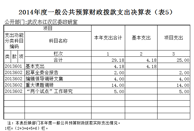 武汉市江汉区委政研室2014年一般公共预算财政拨款支出年度预算为29.18万元,支出决算为29.18万元,完成年度预算的100%。其中:基本支出4.18万元,项目支出25万元。项目支出主要用于起草全委会报告2万元,主要成效圆满完成全委会报告起草任务;用于编辑领导调研文集4万元,主要成效充分展现全区各战线区管领导干部年度调研成果;用于重大课题调研14万元,主要成效完成调研课题任务及其他小型调研材料;用于“两个试点”工作研究5万元,主要成效起草试点工作相关材料,开展学术理论交流。