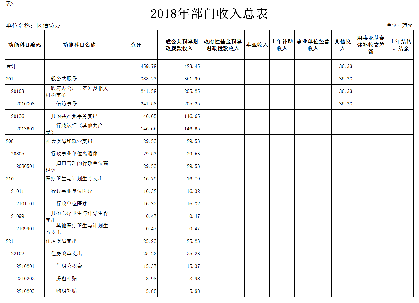 2018年部门预算总收入459.78万元,较2017年年初预算增加66.62万元,增长16.94%。其中:一般公共预算财政拨款(补助)收入423.45万元,其他收入36.33万元,上年结转0万元。