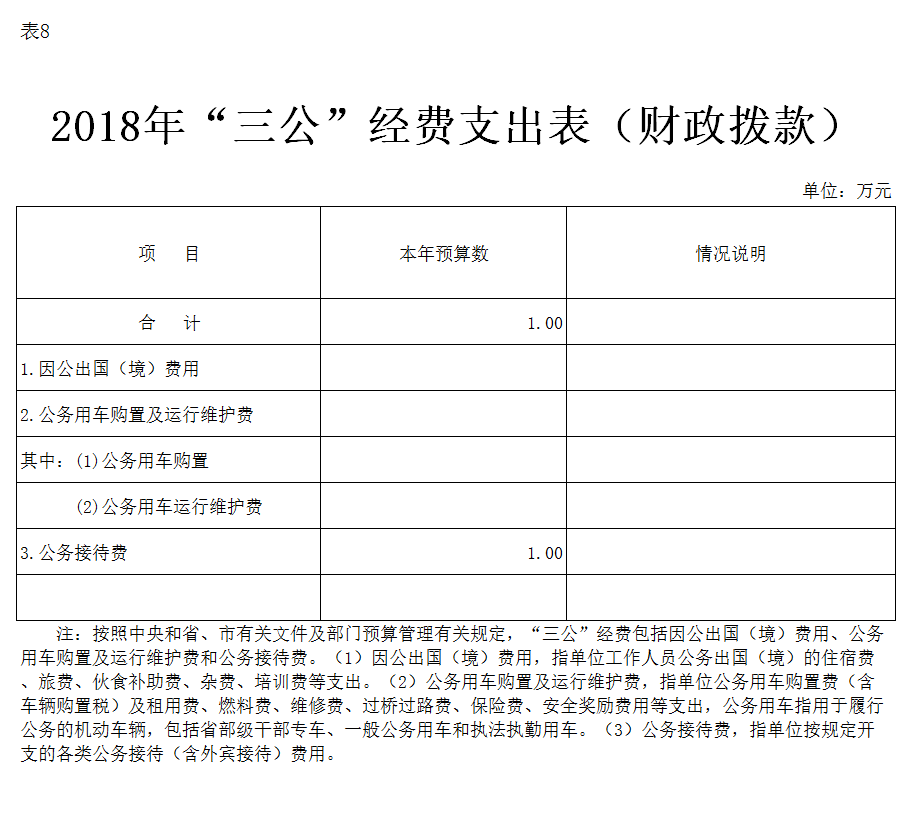 2018年部门财政拨款资金安排“三公”经费预算1万元。具体情况如下: