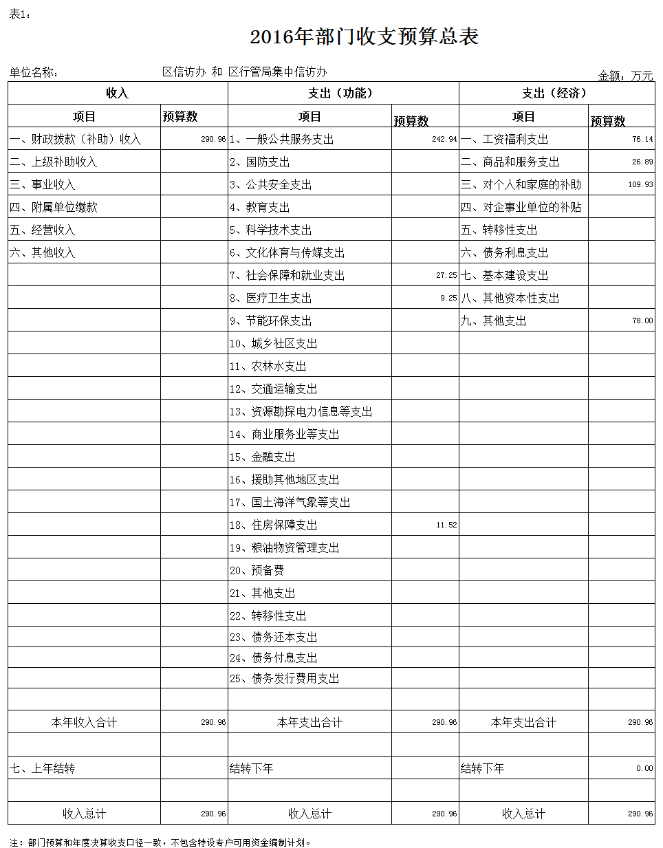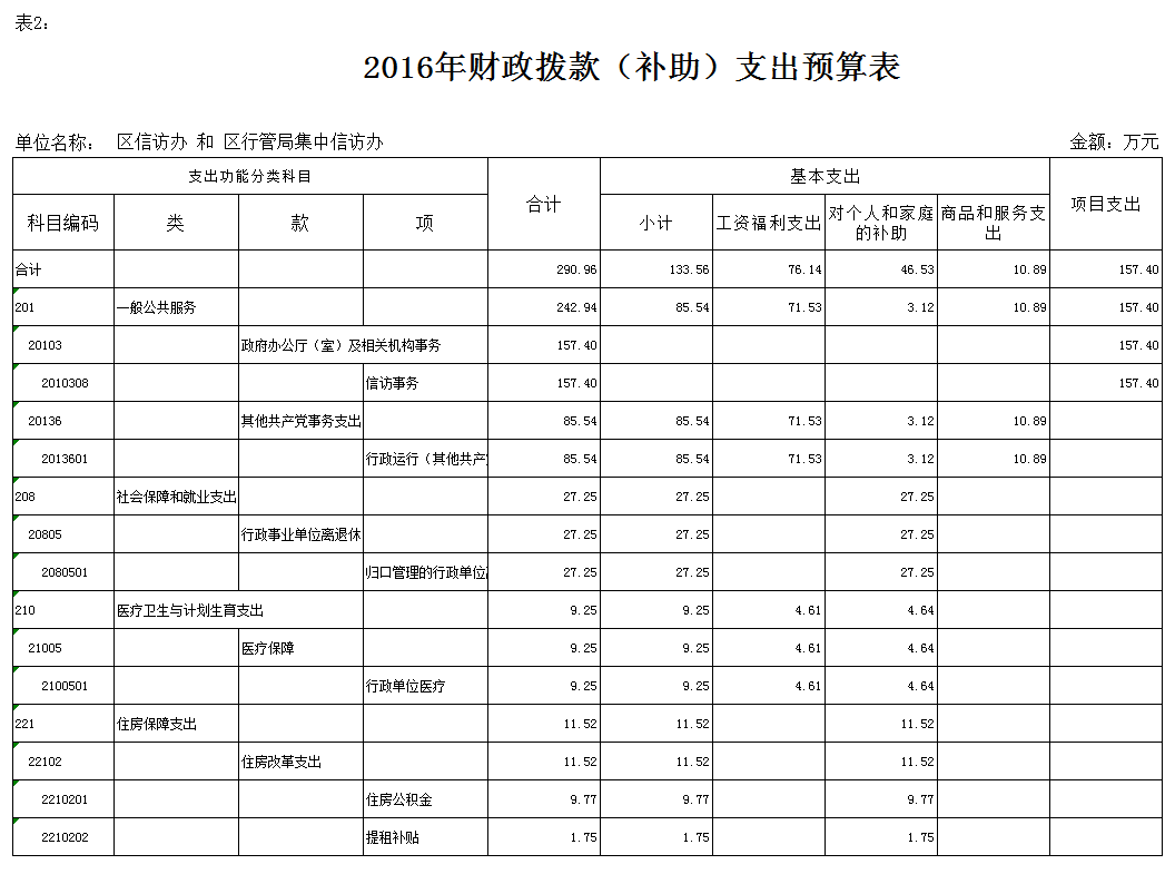 2016年财政拨款(补助)预算数290.96万元,安排情况如下: