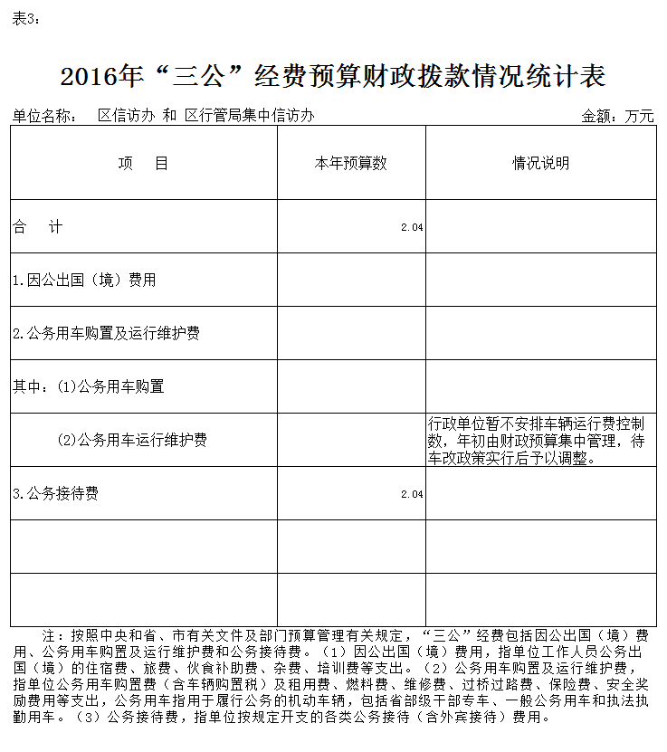 2016年部门财政拨款资金安排“三公”经费预算2.04万元。比上年预算减少3万元。具体情况如下: