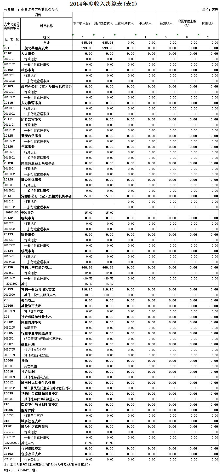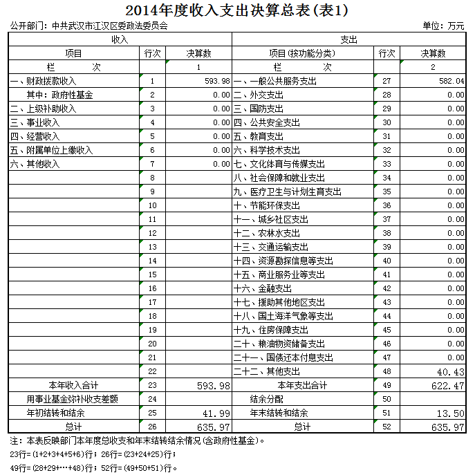中共江汉区委政法委员会2014年度财政拨款(含政府性基金拨款)收支总计635.97万元。