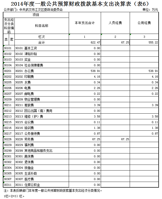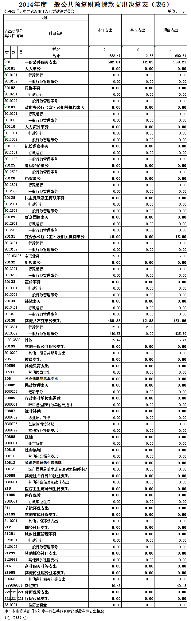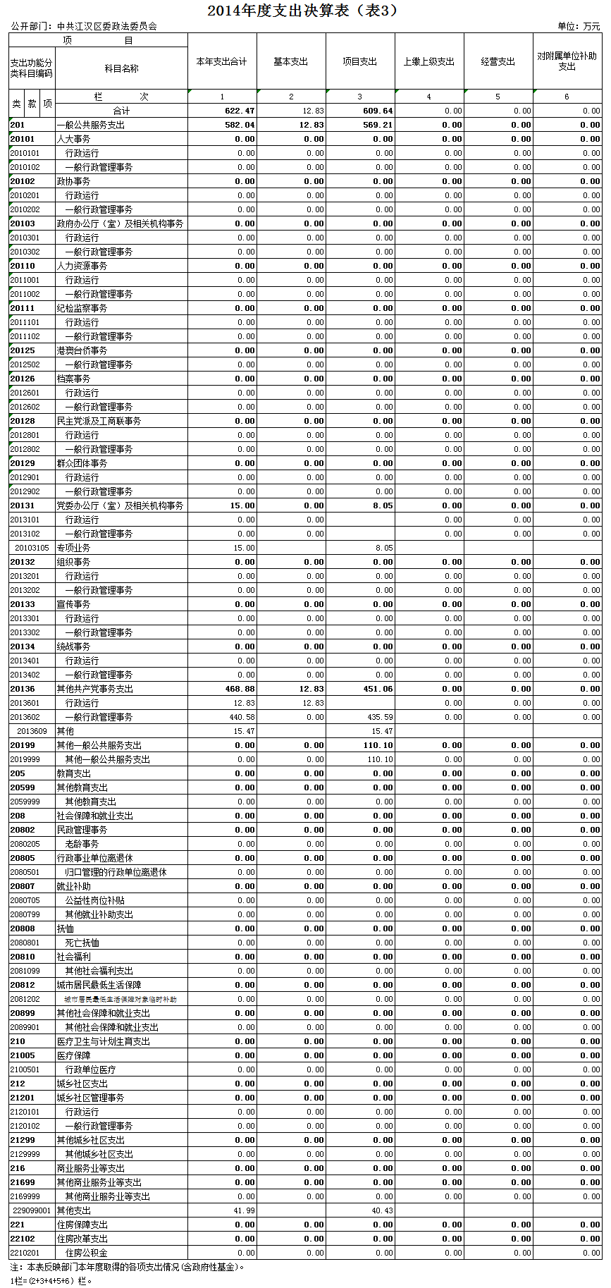 中共江汉区委政法委员会2014年一般公共预算财政拨款支出年度预算为635.97万元(包括年初部门预算、基本建设等专项资金、上级下达的专项转移支付资金及年初结转和结余资金等支出),支出决算为622.47万元,完成年度预算的97.88%。其中:基本支出12.83万元,主要完成日常工作需要;项目支出609.64万元。因部分项目涉密,按照市委要求不宜公开。