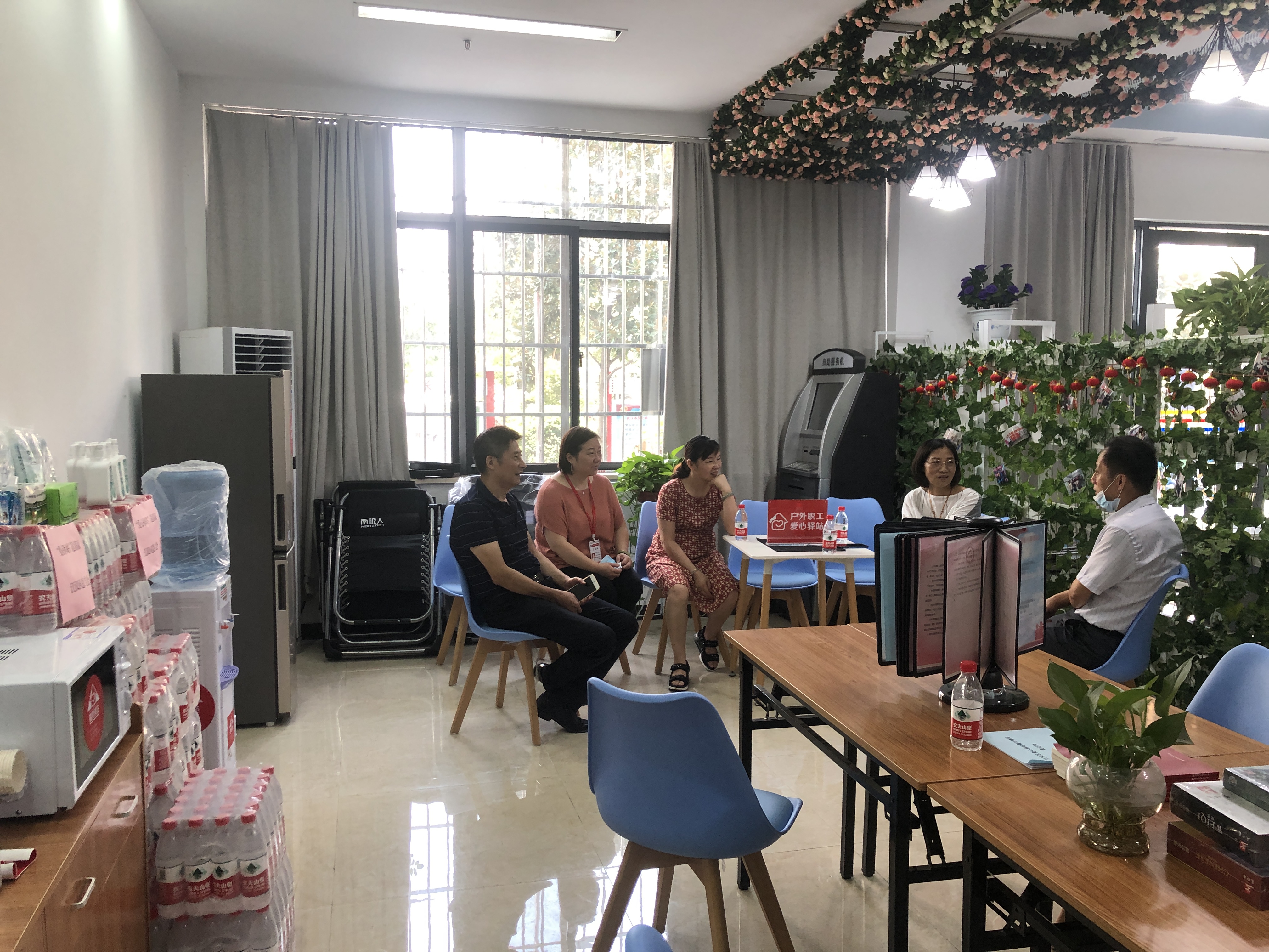 慰问组为区属12个“爱心驿站”配送矿泉水、酸梅膏、免洗手消毒液等1万余元物资,实地走访位于汉兴街、唐家墩、汉口火车站的3个爱心驿站,调研“爱心驿站”运转情况,收集“爱心驿站”现有软硬件配置在日常使用中的效果,力求贴近职工需求,解决实际困难。