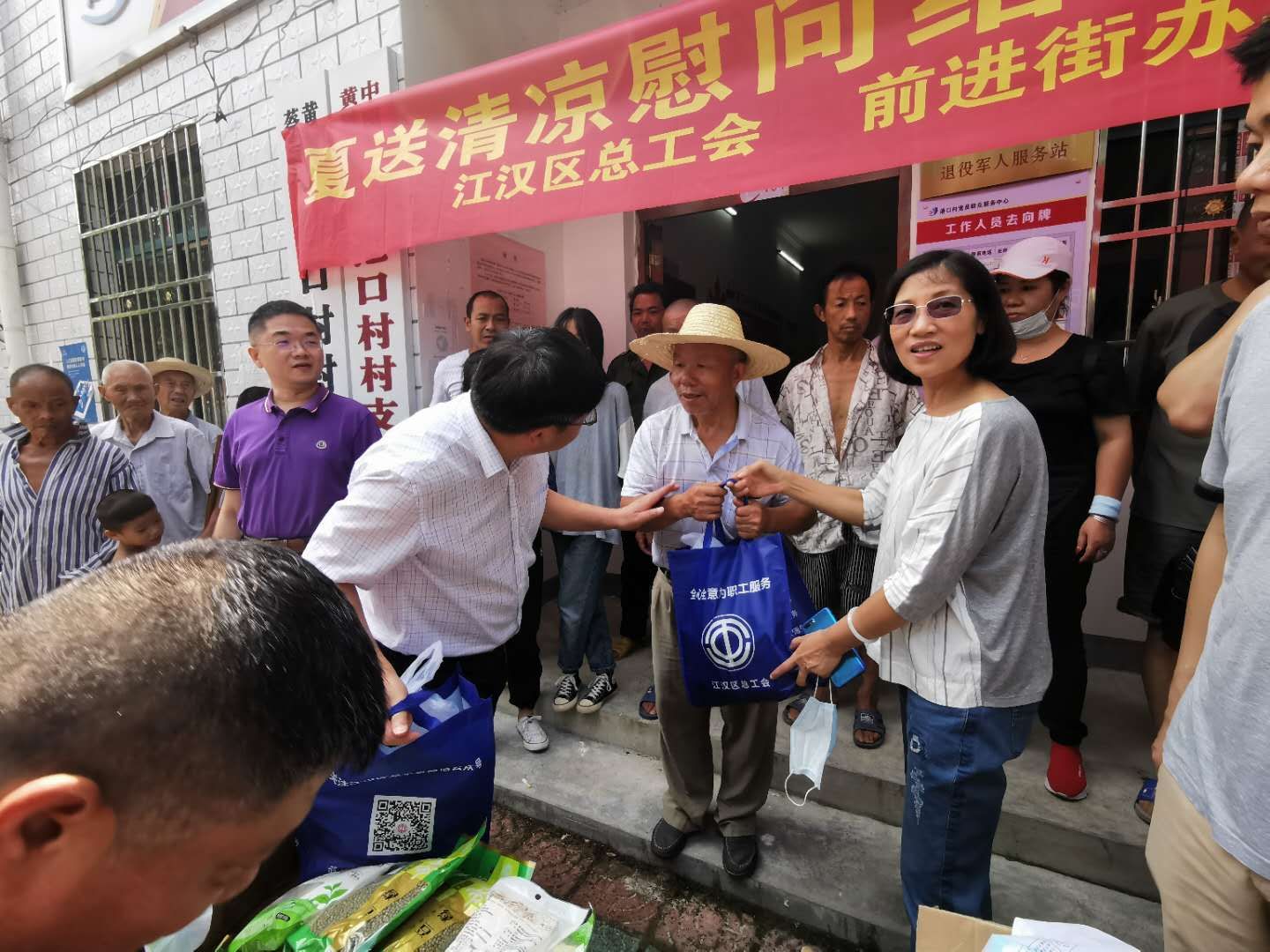 为进一步做好脱贫攻坚工作,近日,江汉区总工会、前进街办事处班子成员驱车近百公里,到黄陂区蔡店街港口村,调研今年的脱贫攻坚工作,并走访困难村民、为他们送去防暑降温物资和防疫用品。