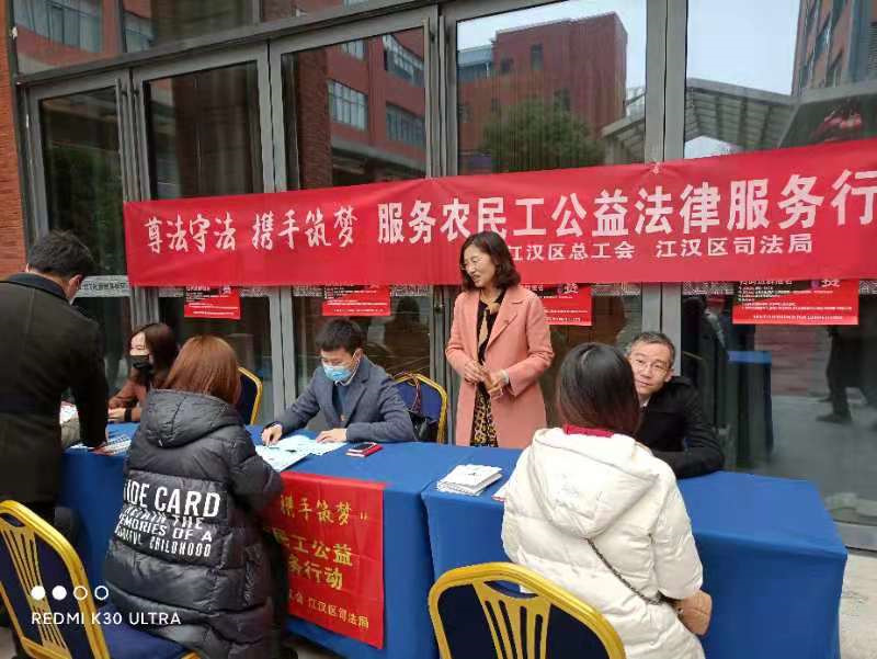 3月5日,江汉区总工会与区司法局职工法援志愿者冒雨在江汉区经济开发区红T时尚广场,开展“遵法守法·携手筑梦”服务园区职工、农民工法律活动。近30名闻讯赶来的农民工接受个性化咨询解答。