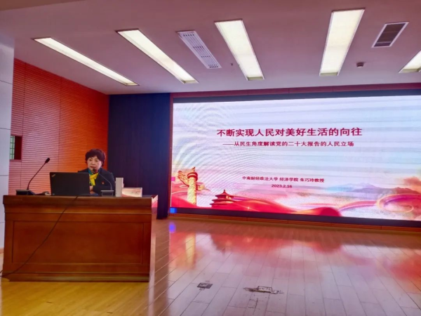 “党的二十大报告强调:增进民生福祉,提高人民生活品质。”报告会上,中南财经政法大学经济学院朱巧玲教授作学习贯彻党的二十大精神宣讲。
