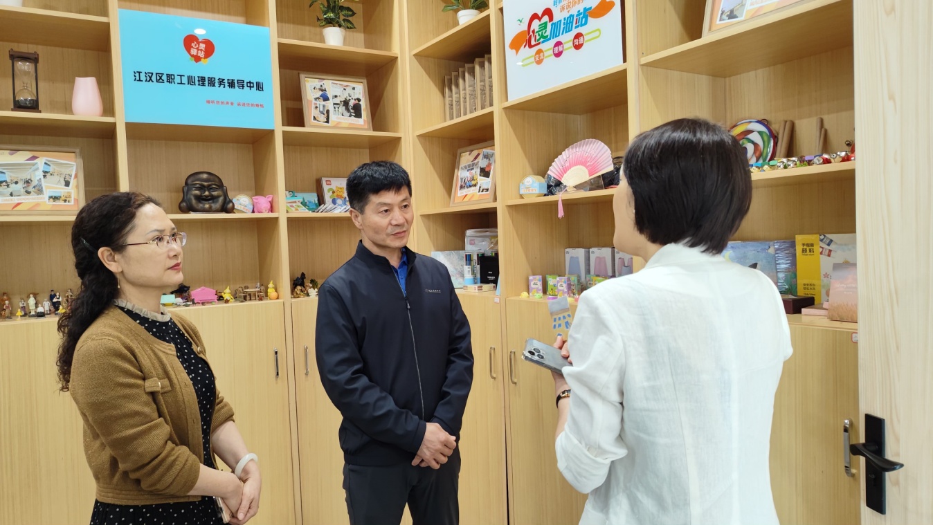 江汉区总工会女职工委员会、经费审查委员会主任陈锦华向调研组详细介绍了江汉区职工心灵加油站建设情况、心理关爱服务活动情况、“心海护航·健康江汉”职工心理关爱行动。