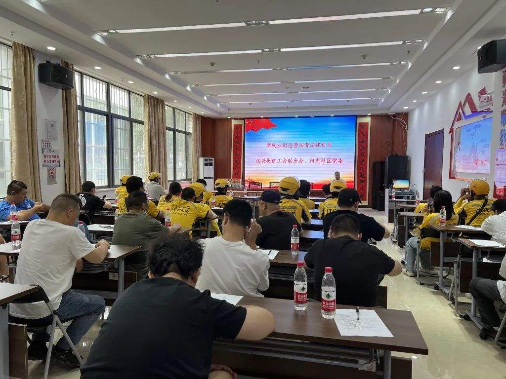 为深入学习宣传习近平法治思想,提高职工尊法、学法、守法、用法的意识,6月15日,由汉兴街工会承办的江汉区总工会“送法进一线”职工法律小讲堂走进阳光社区爱心驿站,辖区40名网约配送员新业态劳动者参加学习。
