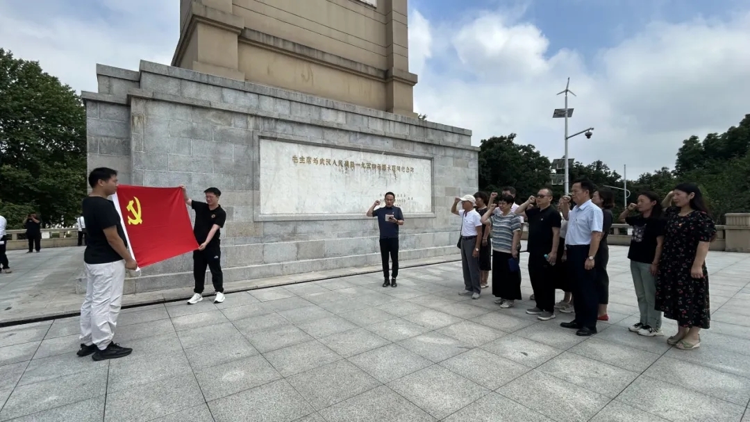 随后,党员们怀着崇敬的心情,来到了伫立在江边的武汉防汛纪念碑前。这座为纪念1954年防汛胜利而建的丰碑,承载着厚重历史记忆,是武汉人民战胜自然灾害的精神象征。碑身正面嵌着乳白色大理石,镌刻毛泽东亲笔题词,苍劲字迹重现抗洪岁月。碑身两侧的浮雕,栩栩如生地展现武汉人民与洪水顽强抗争的震撼场景,彰显了人民群众团结一心、众志成城的磅礴力量。在这意义非凡的地方,全体党员庄严肃立,面向鲜红的党旗,郑重地举起右手,重温入党誓词。誓言铮铮,响彻江畔,这不仅是对党的庄严承诺,更是对先辈们抗洪精神的传承与发扬。