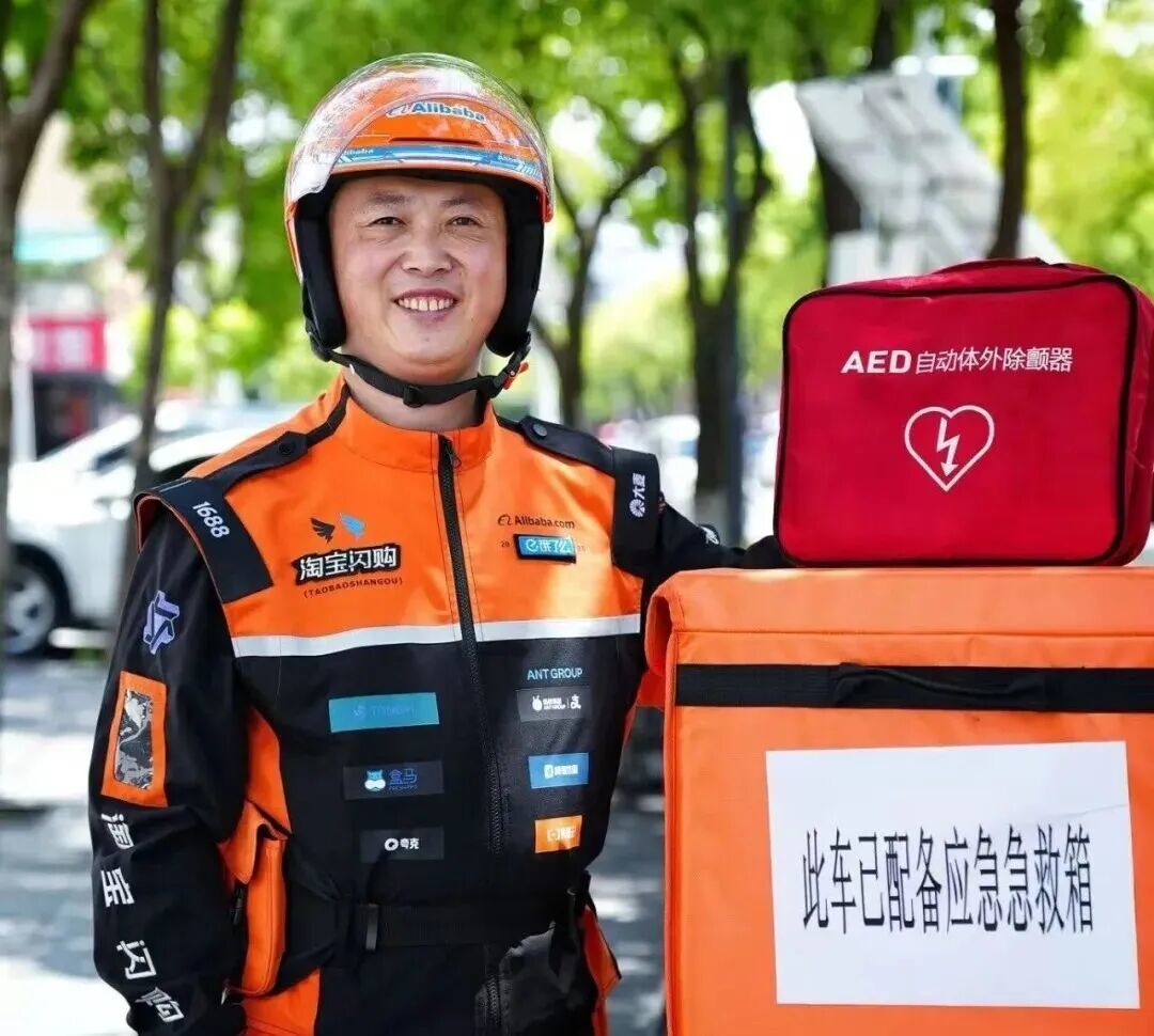 今年3月25日,湖北武汉一名七旬老人遭遇车祸被撞倒地,恰好送餐路过的骑手张宝剑见状立即暂停送餐,取出随车携带的急救包和AED开展施救,为伤者争取到宝贵的救治时间。