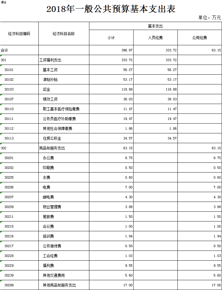 表6.2018年一般公共预算基本支出表
