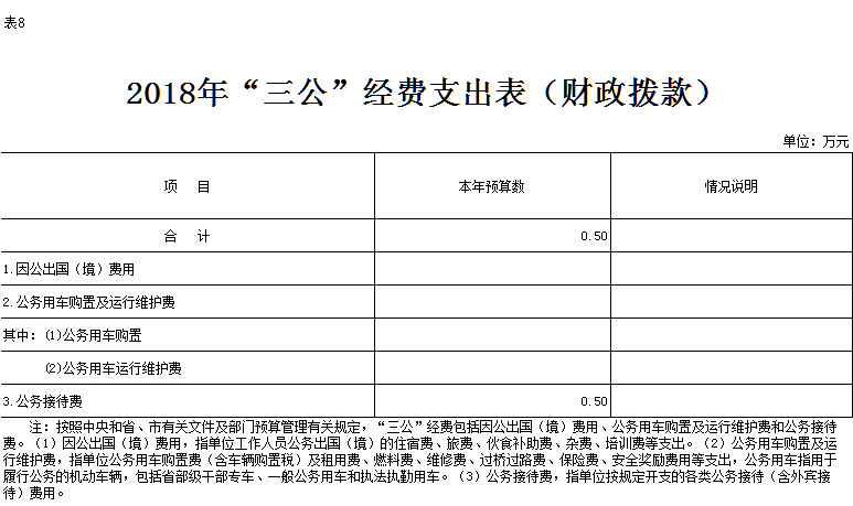 2018年部门财政拨款资金安排“三公”经费预算0.50万元。具体情况如下: