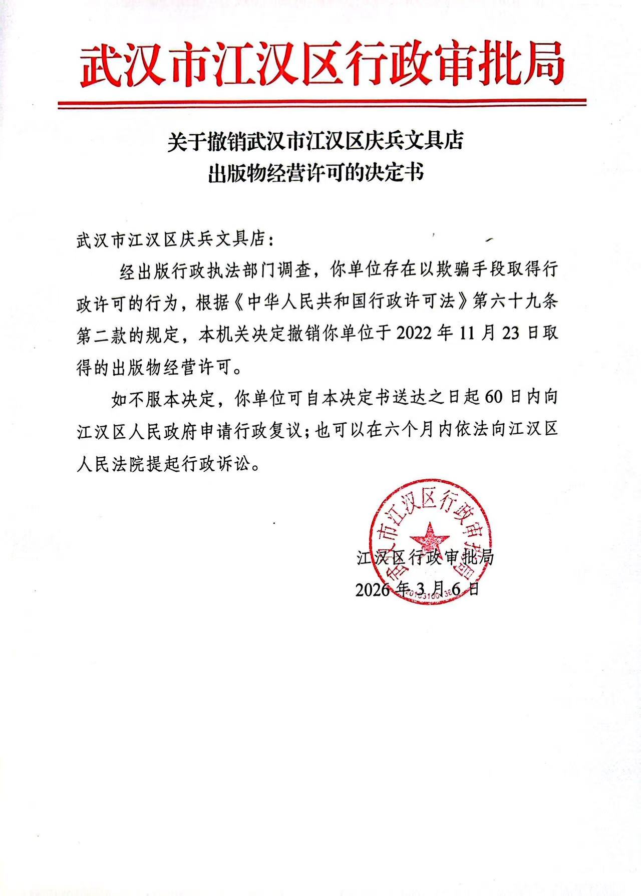 关于撤销武汉市江汉区庆兵文具店出版物经营许可的公告
