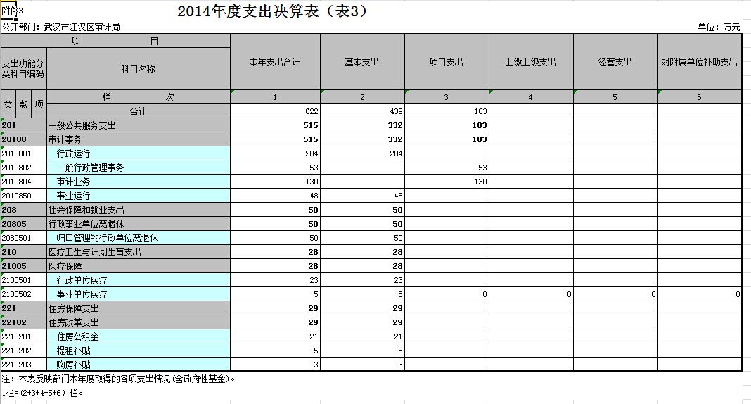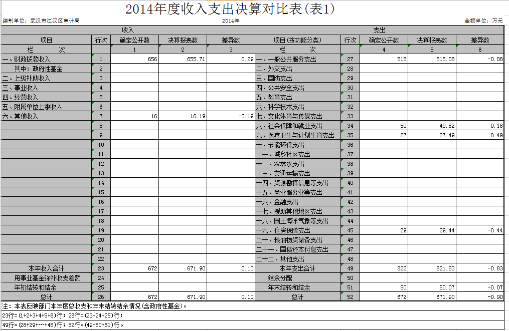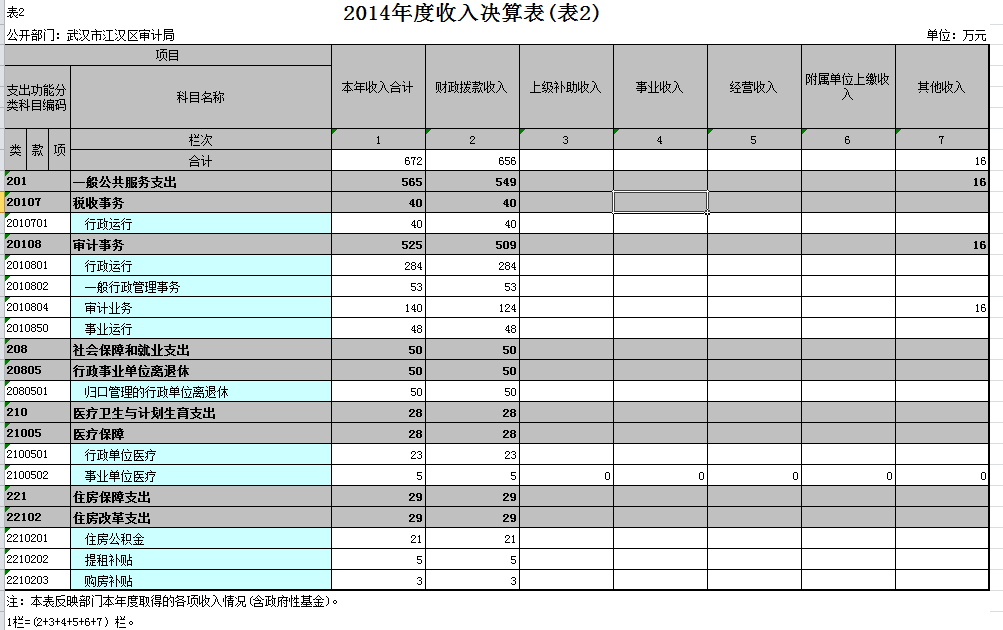 武汉市江汉区审计局2014年度收入总计672万元,支出总计622万元。
