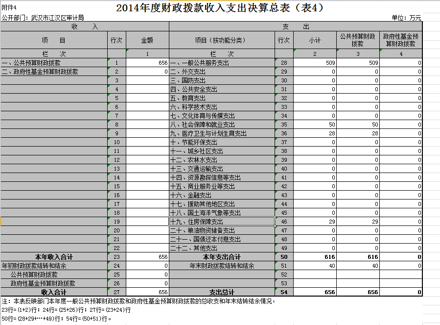 武汉市江汉区审计局2014年度财政拨款(含政府性基金拨款)收支总计656万元。。