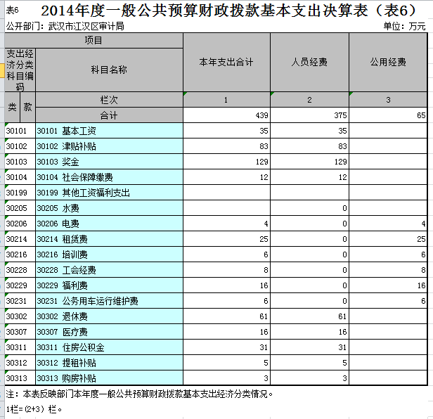 武汉市江汉区审计局2014度一般公共预算财政拨款基本支出439万元,其中,人员经费375万元,主要包括:基本工资、津贴补贴、奖金、社会保障缴费、伙食补助费、绩效工资、其他工资福利支出、离休费、退休费、抚恤金、退职(役)费、抚恤金、生活补助、医疗费、助学金、资励金、住房公积金、提租补贴、购房补贴、其他对个人和家庭的补助支出;公用经费65万元,主要包括:办公费、印刷费、咨询费、手续费、水费、电费、邮电费、取暖费、物业管理费、差旅费、因公出国(境)费、专用维修(护)费、租赁费、会议费、培训费、公务接待费、专用材料费、被装购置费、专用燃料费、劳务费、委托业务费、工会经费、福利费、公务用车运行维护费、其他交通费用、税金及附加费用、其他商品和服务支出、办公设备购置、专用设备购置、信息网络及软件购置更新、其他资本性支出。