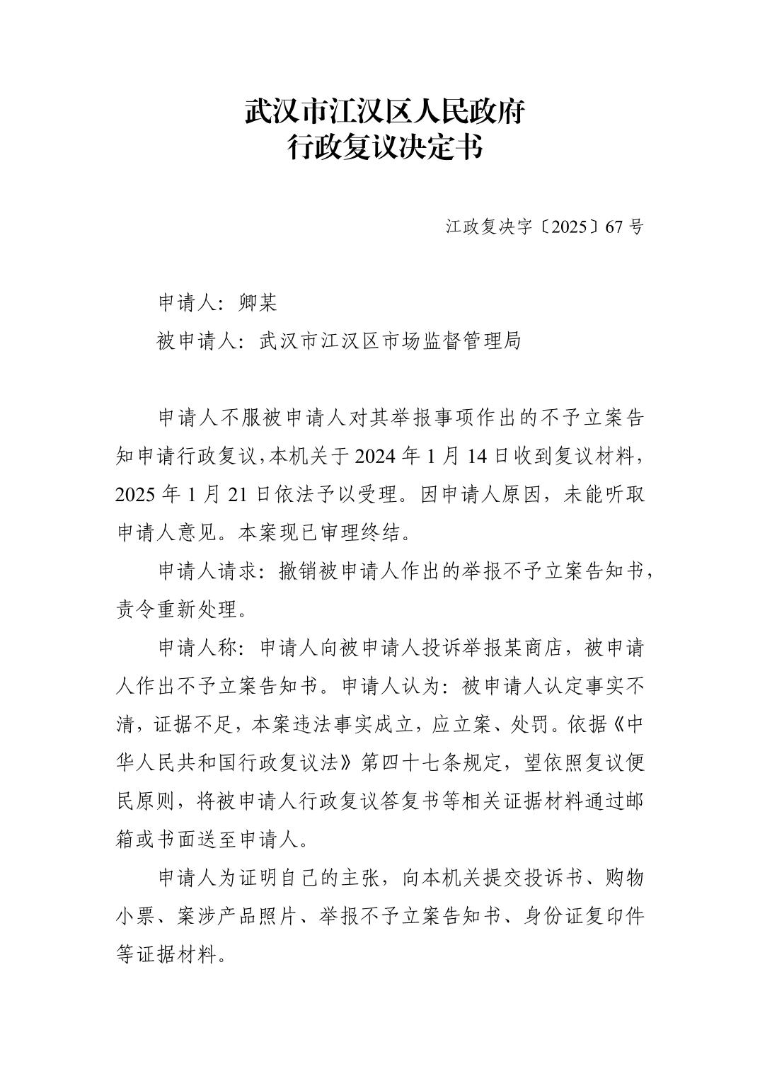 | 标 题 | 江汉区人民政府行政复议决定书-江政复决字〔2025〕67号 | ||