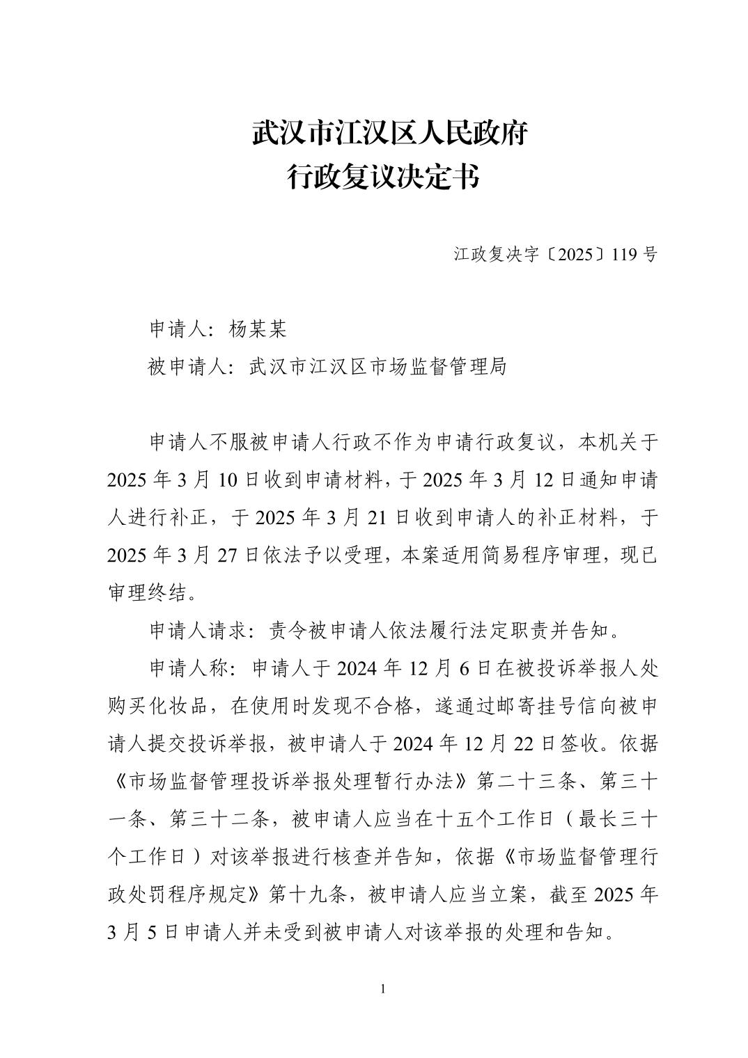 | 标 题 | 江汉区人民政府行政复议决定书-江政复决字〔2025〕119号 | ||