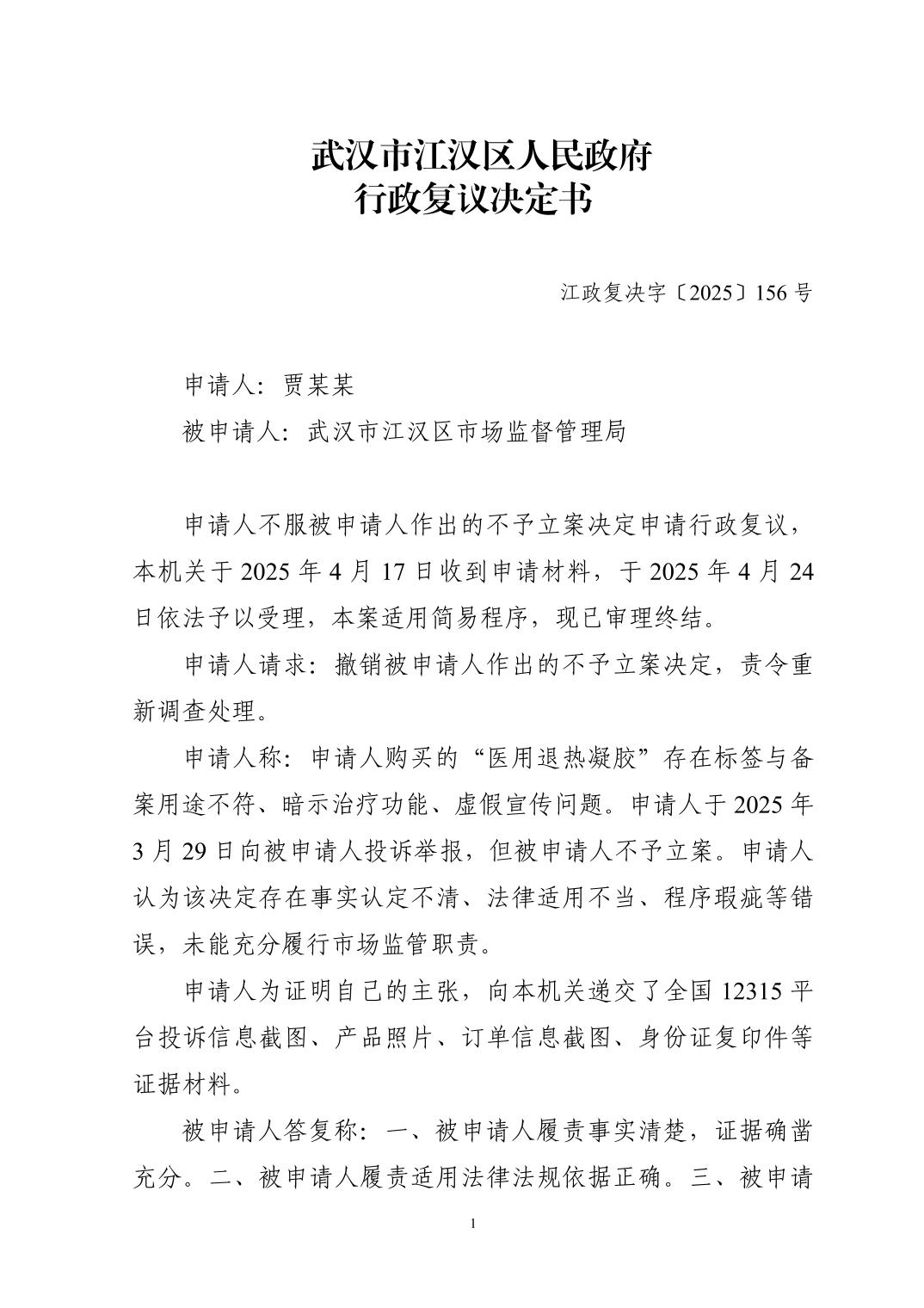 | 标 题 | 江汉区人民政府行政复议决定书-江政复决字〔2025〕156号 | ||