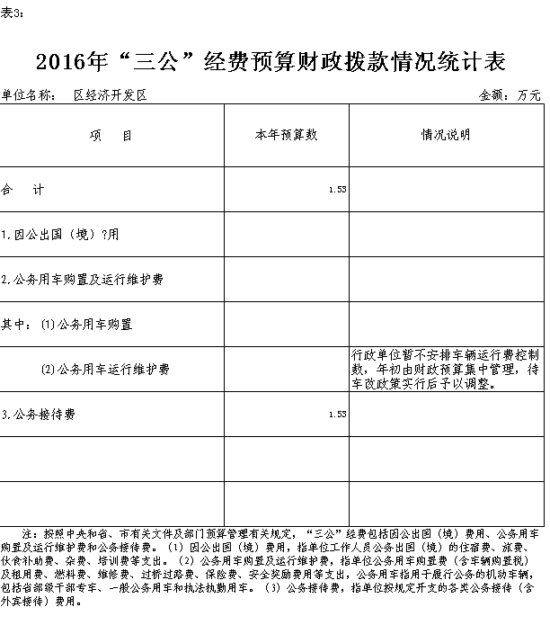 2016年部门财政拨款资金安排“三公”经费预算 1.53万元。具体情况如下: