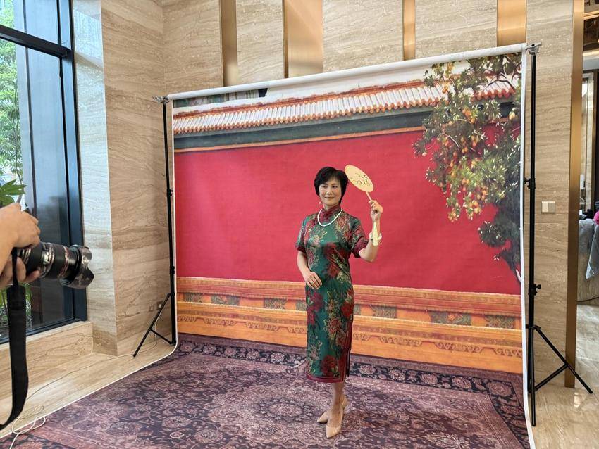 另一边的个人旗袍写真区同样热闹。65岁的张阿姨选了一件藏青色提花旗袍,搭配珍珠耳环与黑色高跟鞋,在化妆师的简单修饰下,气质愈发优雅。“年轻时候就喜欢旗袍,总觉得没机会穿,没想到物业圆了我的梦!”张阿姨手持檀香扇,在水墨风格背景前摆出优雅姿势,每一个眼神、每一个动作都透着自信。摄影团队耐心指导姿势,从站姿到手部动作反复调整,确保每位长者都能呈现最佳状态,不少长者拍完后还忍不住在镜子前欣赏自己的造型,脸上满是欢喜。