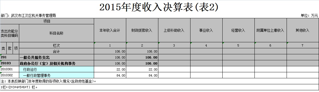2015年度本年收入合计106万元。其中:财政拨款收入(含政府性基金拨款)106万元,占本年收入100%。