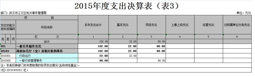 2015年度本年支出合计102万元。其中:基本支出22万元,占本年支出22%,项目支出80万元,占本年支出78%。