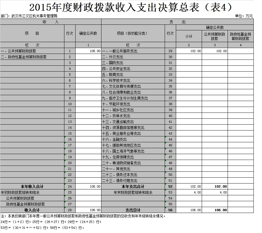 (一)一般公共服务支出(类)。年度预算为106万元,支出决算为102万元,完成年度预算的96%。