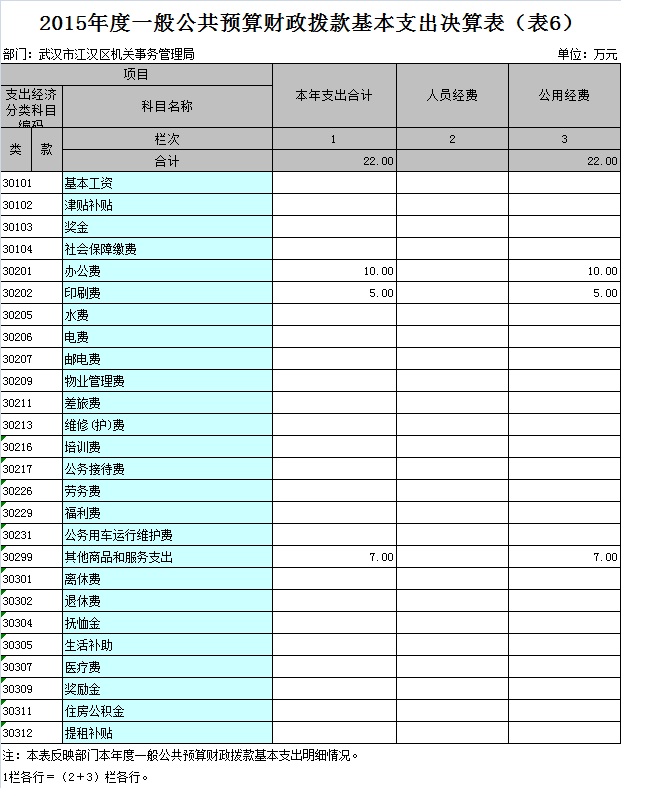 2015度一般公共预算财政拨款基本支出22万元,公用经费22万元,主要包括:办公费、印刷费、咨询费、手续费、水费、电费、邮电费、取暖费、物业管理费、差旅费、因公出国(境)费、维修(护)费、租赁费、会议费、培训费、公务接待费、专用材料费、被装购置费、专用燃料费、劳务费、委托业务费、工会经费、福利费、公务用车运行维护费、其他交通费用、税金及附加费用、其他商品和服务支出。