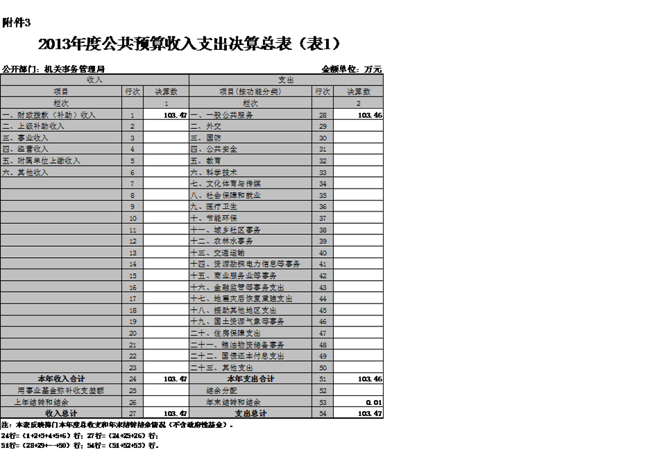 武汉市江汉区机关事务管理局2013年收入总计103.47 万元,其中:本年收入合计103.47万元,支出总计103.47 万元,其中:本年支出合计103.46万元,结余分配0.01万元,年末结转和结余0.01万元。