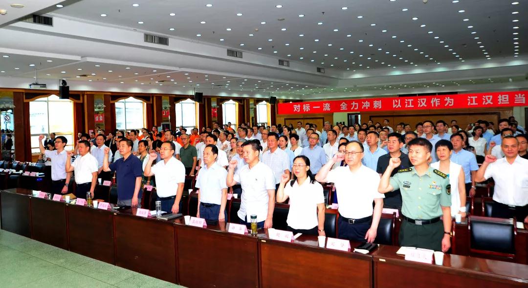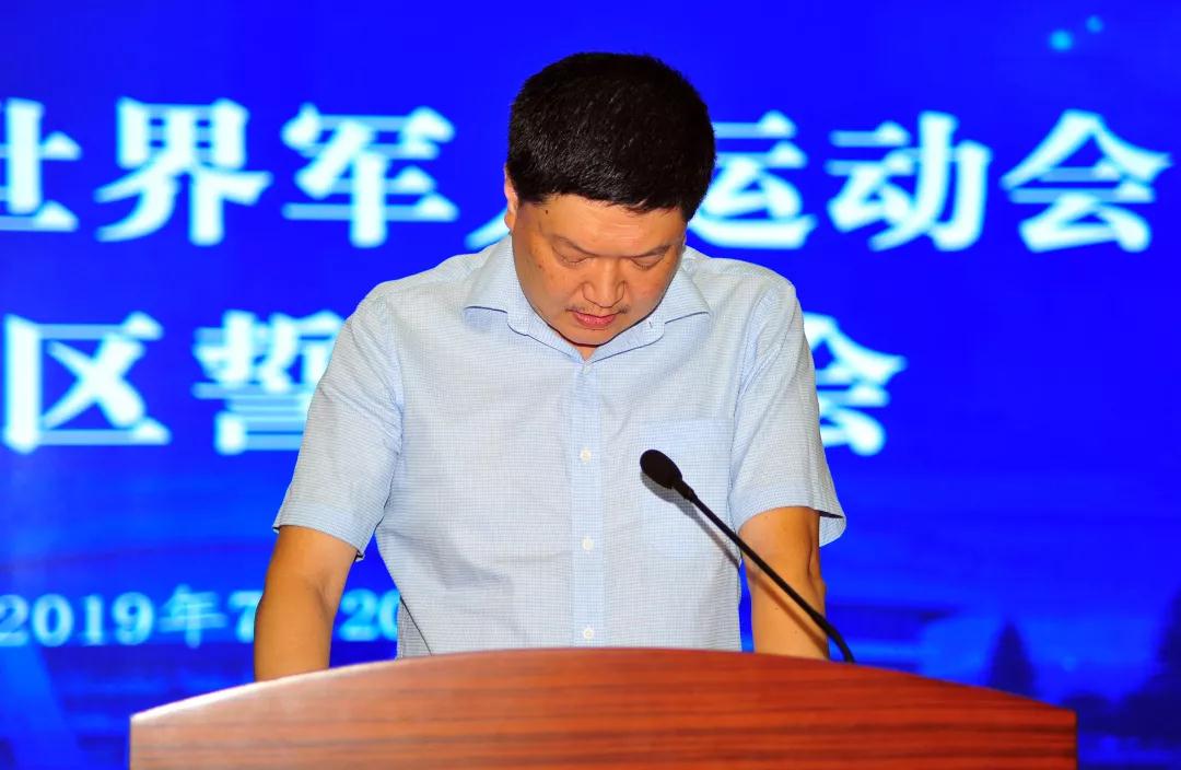 在区委常委、常务副区长张劲的监誓下,副区长张智勇,军运会志愿者城市大使、长江日报高级记者余熙,爱帝集团董事长胡爱娣带领军运会江汉区功能品质提升行动指挥部、军运会足球(江汉)竞赛委员会、区军运会城市行动指挥部部门负责人宣誓。