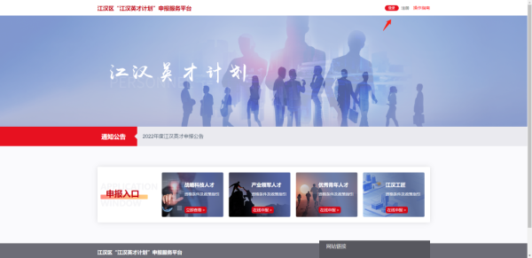 打开武汉人才服务网http://www.whzc.gov.cn,点击【人才服务】-【人才服务事项】-【区级人才申报】-【江汉英才申报】