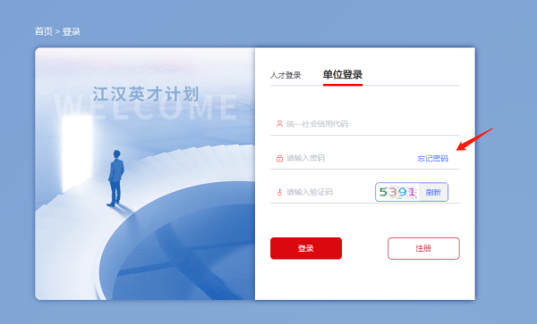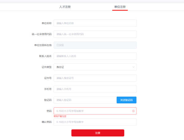 进入登录页面后,点击右边“单位登录”进入单位用户登录界面,点击“注册”选项,输入单位信息并完成手机验证后即可完成注册