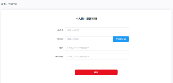 点入登录/注册后,点击右侧蓝色标识“忘记密码?”进入密码修改页面。通过短信验证手机号码(在注册时填写的手机号)并输入统一社会信用代码后即可进行修改。