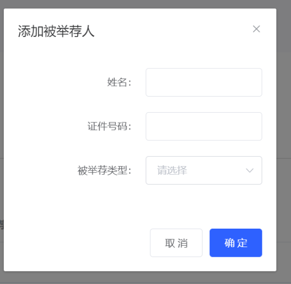 填写被举荐人信息,包括姓名、证件号码、被举荐的类型等,不同的类型填写内容不同,点击确定。