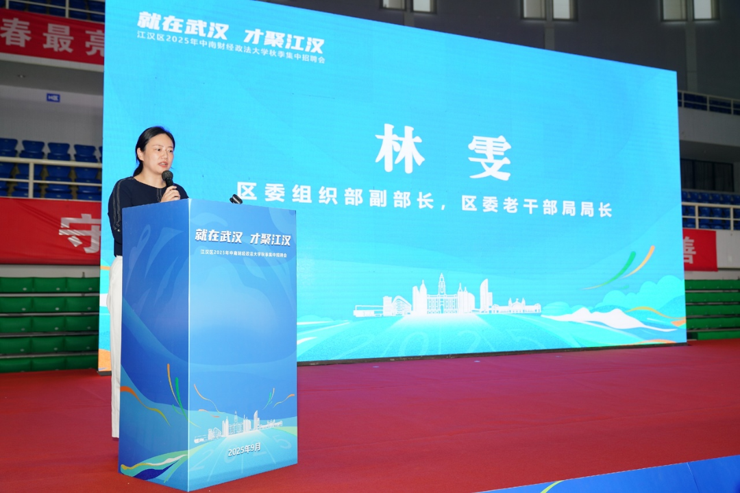 江汉区委组织部有关负责同志致辞,介绍了江汉充满活力的产业体系、深厚的历史文化底蕴、宜居宜业的人才发展生态,并诚挚地邀请以中南财经政法大学为代表的名校学子,来江汉这片人才聚集和创新创业的热土擦亮青春底色,书写人生华章。