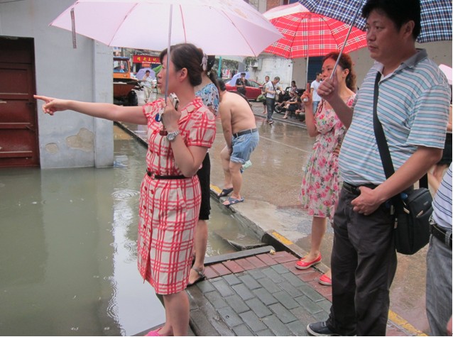 下午3时左右,街办事处主任李虹、副主任程然、武装部长陈劲力及办公室主任王俊武一行从万松园路南段一路涉水步行到北段雪松路、青松社区老三栋、十巷老危房区域和白松社区净菜市场周边现场实地察看渍水情况,现场调度,并看望转移出来的灾民和慰问社区群干。