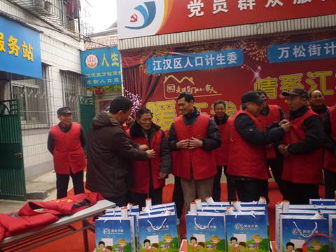 在活动现场,区计生委李主任不仅向扁担哥每人赠送了一件红棉背心,还细心的为扁担哥整理衣衫,帮他们把这贴心的马甲给扣好。让他们在这寒冷的冬季有一件贴心的棉马甲穿在身上,为他们抵御着寒冷,也让他们工作得更干劲十足。最后,区计生委李主任和街领导还向每一位扁担哥和打工妹赠送了一份新春大礼包和一份计生药具,希望他们度过一个健康、平安的新春佳节,也希望他们在新的一年里,事业旺旺、工作旺旺,身体旺旺,万事旺旺。