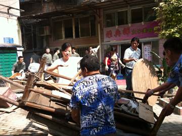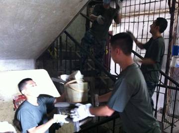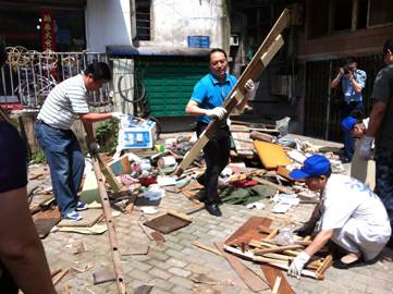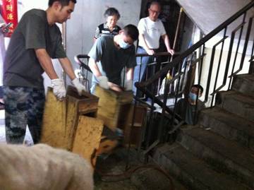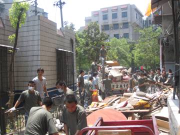 在街道、社区统一安排下,100余名官兵分为3个小组,分别对15栋、42栋、43栋楼道乱堆乱放的垃圾进行了大清除。士兵们年轻力壮,成为清理楼道堆放物的主力。他们不怕脏、不怕苦、不怕累,在楼道内排队接力,形成了一条传送带,破家具、旧床垫等杂物被一件件清理出来,然后搬上垃圾车。士兵们一个个汗如雨下,有的手和腿被划伤,有的衣服被弄脏刮破,但他们顾不上处理,一直坚持到最后。街工委书记薛刚敏、办事处主任李虹带领街道机关干部,与部队官兵并肩作战,一些围观的居民群众受到感染,自觉加入到清理队伍中来。经过3个多小时的奋战,取得阶段性成果,共清理生活垃圾近30吨。15栋、42栋和43栋楼道内变得宽敞明亮、干净整洁了,其它卫生死角也得到彻底清理。居民群众舒心了,齐声称赞部队官兵好、军民鱼水亲。