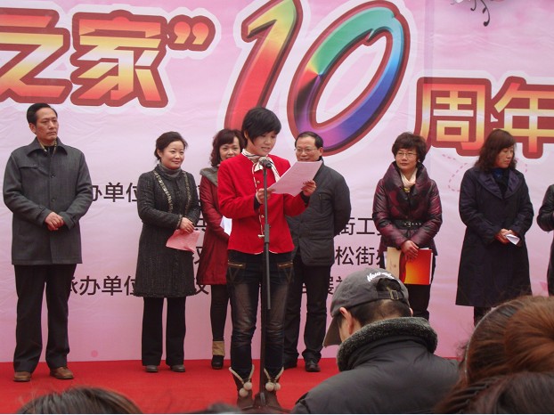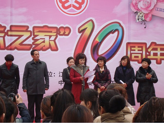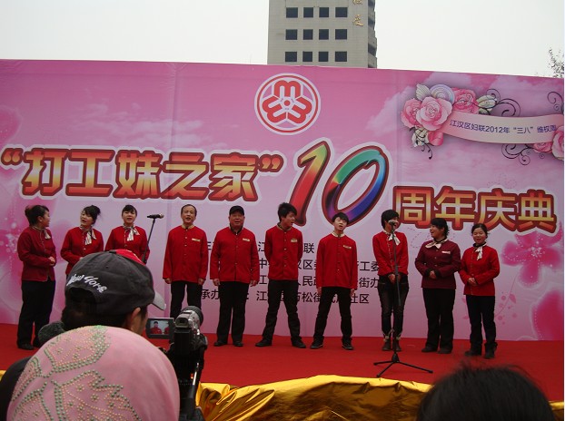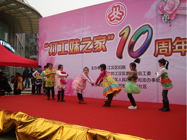 2012年2月24日下午三点,万松园路口创世纪广场上人头攒动,万松街武展社区“打工妹之家”十周年庆典活动正式开始。活动由江汉区妇联主席方珺主持,省、市妇联领导均到场祝贺,并发表讲话,随后的文艺演出也给在场的观众带来阵阵欢笑。