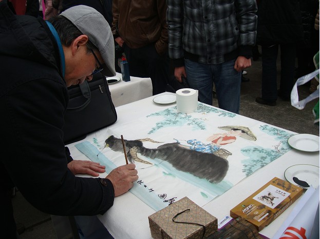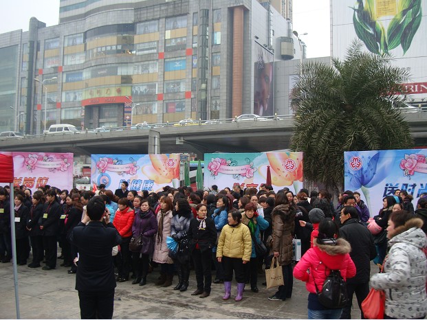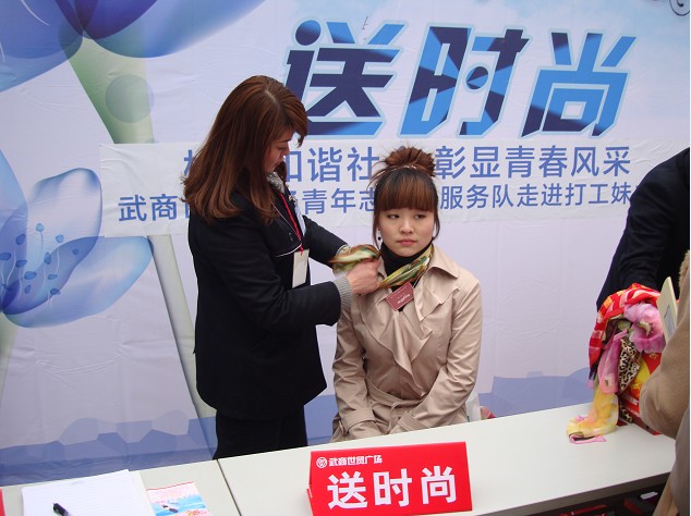 庆典现场同时开展的还有“五送” 活动—— “送健康、送平安、送文化、送时尚、送岗位”。区妇联请来区妇幼保健所的医生为打工妹讲解生理卫生知识与心理卫生知识;市文史馆请来画家、书法家现场作画并赠书;世贸广场志愿者现场演示如何化妆、盘发及花样丝巾的系发等;世贸广场和四海一家带来企业简介和招聘简章,进行现场招聘。整场活动持续了近两个小时,虽然天气寒冷,但党和人民政府及辖区单位对外来务工人员的关怀,却让人感觉到了春天般的温暖。