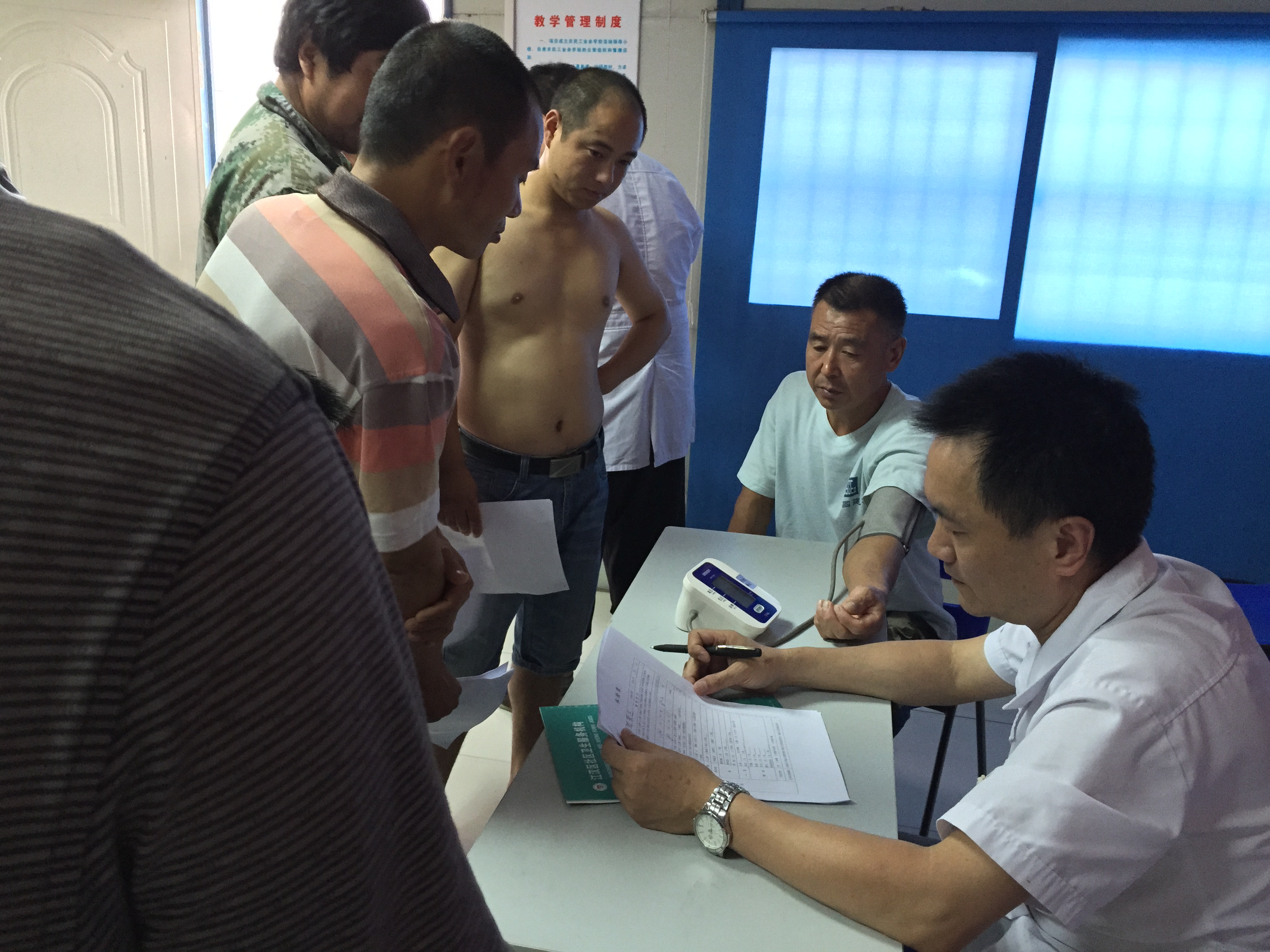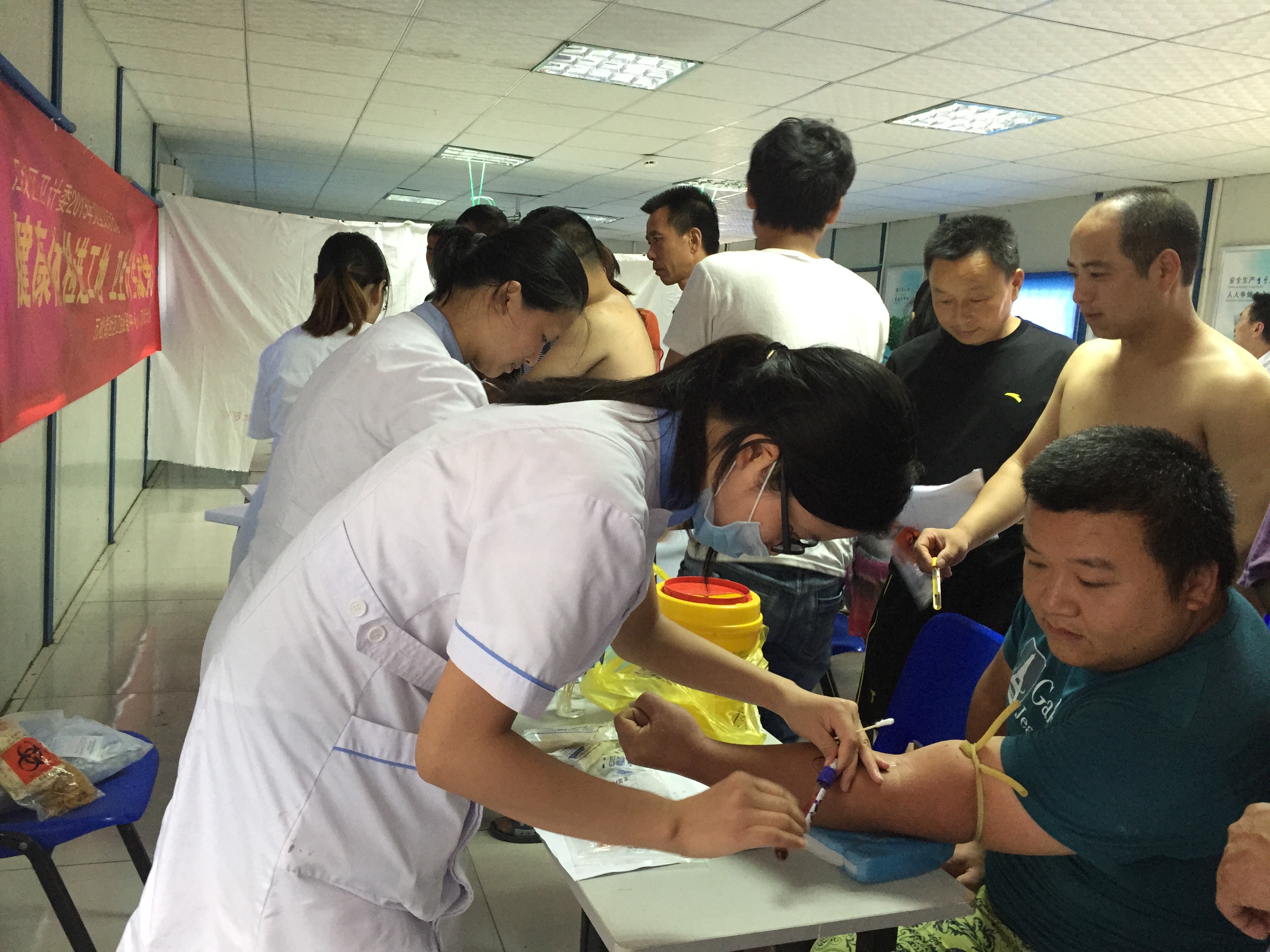健康体检进工地 关心关爱农民工 ---江汉区卫计委2015大型义诊活动 2015年7月14日,由江汉区计生协、万松街社区服务中心、万松街计生协共同组织10多名计划生育专家和医务人员,为王家墩中央商务区农民工兄弟们开展“健康体检进工地、卫生计生献爱心”大型义诊活动,为农民工兄弟进行免费体检。 顶着高温酷暑,10多名计划生育专家和医务人员清晨7:30就到达了中央商务区工地,为100多名一线农民工兄弟们进行了心电图、血常规、尿常规、内外科、血压、B超等一系列检查,同时医护人员针对建筑行业常见职业病、相关危害及防治措施进行了详细讲解,加强了农民工对职业病防治的意识,使他们对职业健康权益保护的观念得到了提升,有效地提高了群众对计生卫生工作的理解度、支持度、参与度和满意度,使广大外来务工流动人口真正享受到了居民化服务,受到了农民工的赞誉和好评。