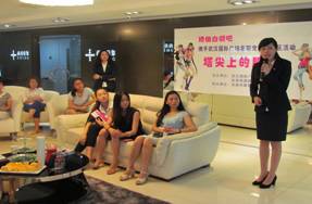 2014年 6月26日下午3点,武展社区娇俏白领吧携手武汉国际广场在职党员、尚美形象管理联合在武广写字楼21楼尚美形象为辖区单位的女白领们举办了文化沙龙活动------“塔尖上的服务”。