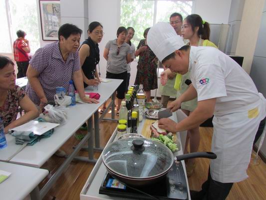 课堂上,欣和调味品公司的营养师向居民们介绍了健康的烹饪技巧及合理的食材搭配方法,并安排厨师现场示范,教大家制作两道简单营养的日常菜品,清蒸鳊鱼和凉拌西兰花,做清蒸鳊鱼还告诉大家如何做成孔雀造型如何改刀,并就所用食材的营养成分进行了讲解。在和居民的互动过程中,大家也纷,畅谈了自己在生活中的烹饪小窍门。