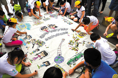 每一个未成年人都是“祖国的花朵”,今天上午,一场主题为“我的中国梦”之青少年主题教育实践活动,在万松街青年社区开幕。卫星村小学学生进行同台绘画,现场绘制了一幅主题为“红领巾相约中国梦”的6平方米大型画作。