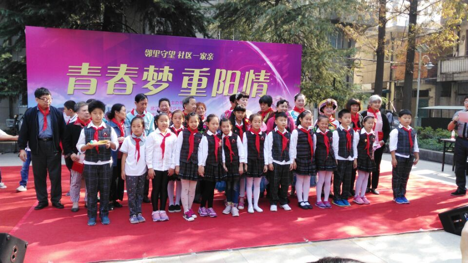 武展社区的居民中,活跃着一批老年志愿者。他们年近花甲、有的已年逾古稀,热心地为小区的居民义务巡逻、值班、清洁卫生环境,维护 小区的安定和整洁;有的老年志愿者在社区为居民组织读书恳谈会,义务宣讲道德文明;还有的老年志愿者为社区的保洁、保绿奉献自己精心栽培的花草。为了表彰这批老年志愿者、弘扬社会主义道德风尚,社区党 委给这些老年志愿者的优秀代表颁发了荣誉证书,滑坡路小学的学生们系上了红领巾,送上自己亲手做的节日礼物给爷爷奶奶们,祝爷爷、奶奶们节日快乐。孩子们真心的祝福,赢得了在场老人们热烈的掌声。世贸广场海燕劳模服务队、武商广场志愿服务队、武商量贩“我帮您”志愿服务队、武商大物业“520”水电维修服务队、国际广场青年志愿服务队、江汉区人资局青年志愿服务队、江汉区妇联巾帼志愿服务队、华信物业消防安全宣传志愿服务队等八支志愿服务队也在此次活动承诺将一如既往的为辖区居民提 供最便利的志愿服务,让更多人感受到志愿服务的力量,让生活中处处充满关怀。武商量贩“我帮您”志愿服务队还为社区的高龄老人、空巢老人送上了三十份节日大礼包,希望老人们永远开心快乐。